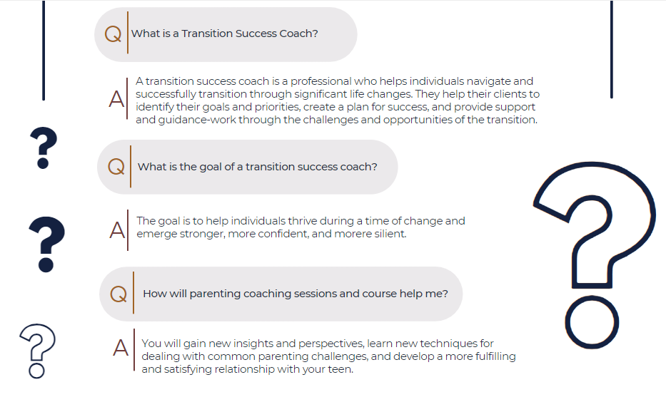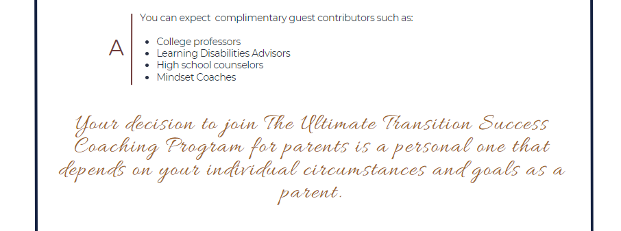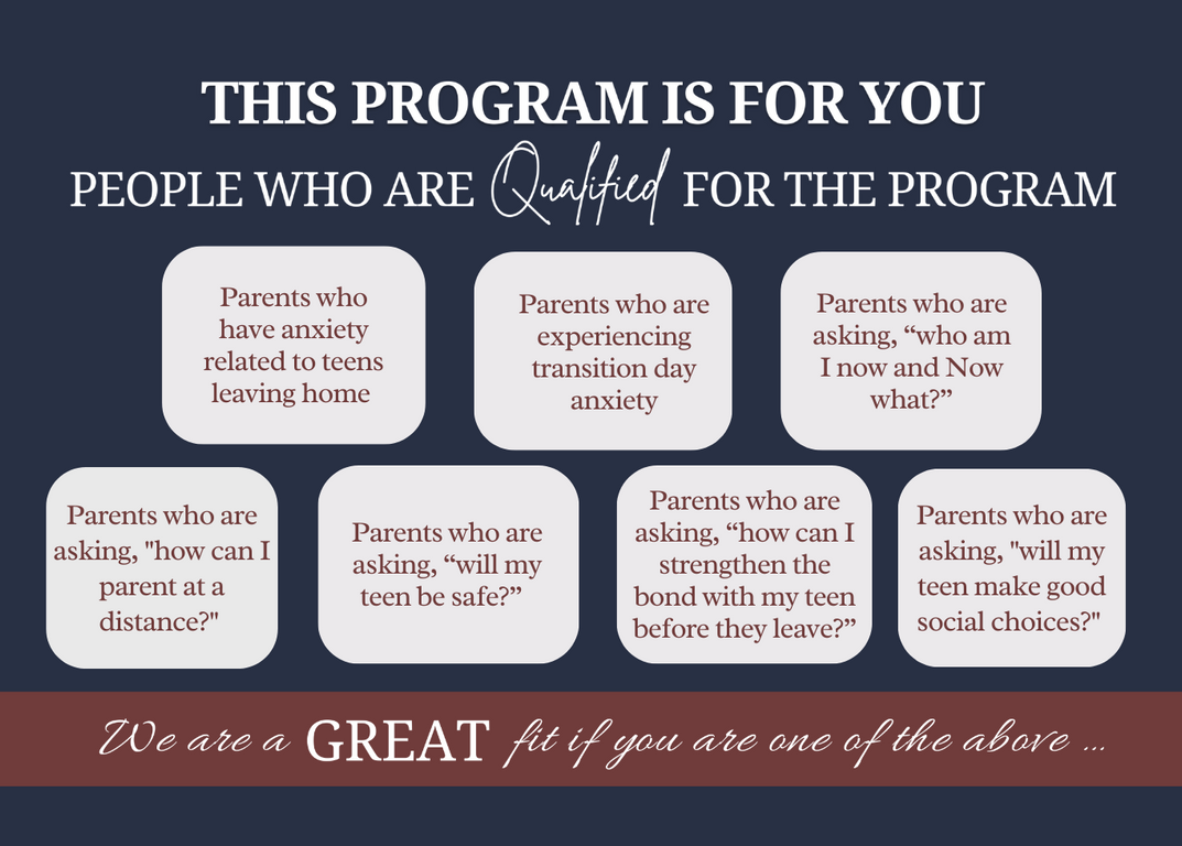 Embarking on your teen's journey out of the home can be overwhelming, and I understand the depth of your concerns. The Ultimate Transition Success Coaching Program, provide more than just guidance – we offer a heartfelt support system tailored to your unique worries. You're not navigating this alone; our community is here to share, empower, and guide you through the challenges. Step into a future where your concerns find understanding, and you navigate your teen's transition with compassion and confidence.